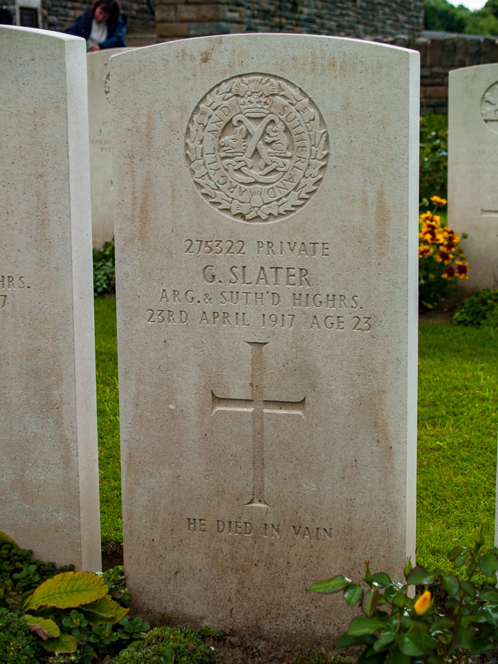 He Died in Vain: Private G Slater, Level Crossing Cemetery, Fampoux.