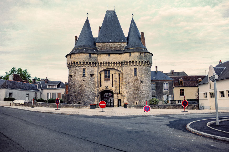 Gardens, Porte d'Eau and Église de la Trinité, from Rue Antoine du Bourbon, Vendôme.