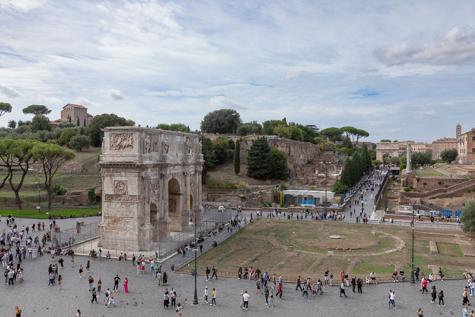 Arch of Constantine, Meta Sudans, Via Sacra and Palatine hill from the Colosseum.