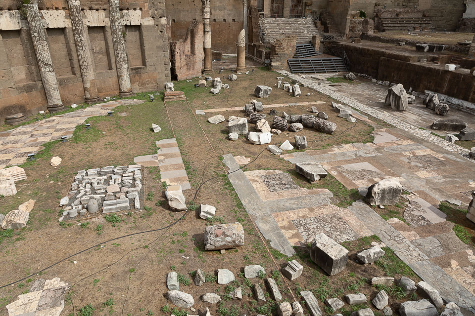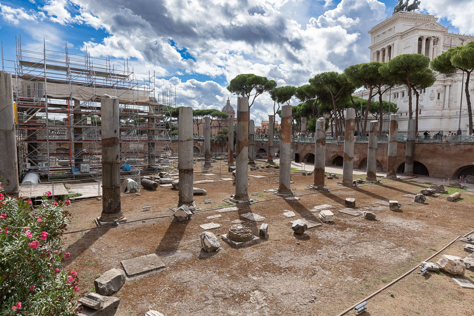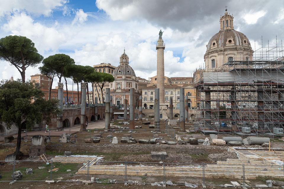 Looking from the Markets' top level to the continuing excavation works, with the surviving three columns of the Temple of Venus Genetrix in the Forum of Julius Caesar across the road.