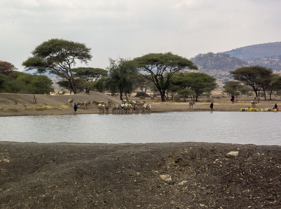 Donkeys , dogs and humans at a Water Hole in Tanzania