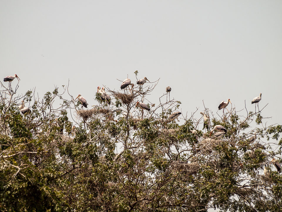 Pelicans and Storks sharing nesting spots in trees, Lake Manyara National Park, Tanzania