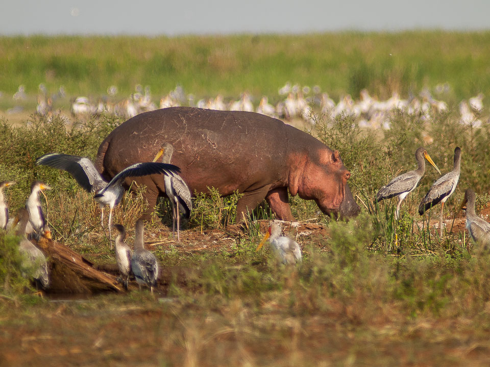 Hippopotamus and Yellow-billed Storks at Lake Manyara National Park
